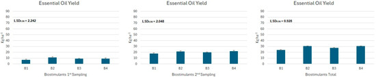 Mean essential oil yield (kg ha−1) for the different biostimulants treatments (B1: control, B2: seaweed extracts, amino acids, vitamins, trace elements, polyphenols, antioxidants and mannitol, B3: plant amino acids, glutamic and aspartic acid, vitamins and other nutrients, and B4: is a combination of B1 and B2 in a 1:1 ratio) where significant differences were found.