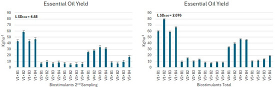 The essential oil yield serves as the primary metric for evaluating the quality of aromatic and medicinal plants. Research indicates that the application of various biostimulants significantly affects essential oil yield, regardless of the specific plant variety. Notable statistical differences were identified among the tested varieties, the biostimulants utilized, and their interactions (see Figure 4).