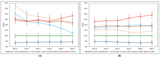 Referring to Ay (Figure 1A), the average increase in future scenarios is expected to reach 28%. The yield for Ay is projected to grow more significantly than that of Py, driven by higher rainfall. Under rainfed conditions, soybean plants are likely to achieve yields closer to their maximum potential. Furthermore, the likelihood of yield losses is predicted to lessen. Early sowing may face higher risks of failure due to water shortages, especially during the flowering phase when water demand peaks. With anticipated increased rainfall, late sowings should experience less vulnerability to water stress. Additionally, water needs will decrease due to cooler temperatures and less solar radiation. The most pronounced yield enhancements for Ay are forecasted to occur during the initial sowing dates in RCP 4.5, for both mid-century and late-century scenarios. In both cases, the smallest yield increments are expected at later dates, with increases ranging from a high of 58% to a low of 5%.