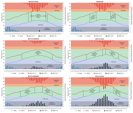 The averages of annual and seasonal climate variables for all scenarios are presented in Supplementary Material Table S1. The yearly climate data were divided into 36 periods. Each month was segmented into three periods with an average of ten days each. The first monthly period starts on the 1st day and goes until the 10th, the second from the 11th to the 20th, and the third from the 21st to the last day of the month. The monthly ten-day intervals are labeled JAN.1, JAN.2, JAN.3, FEB.1, FEB.2, FEB.3, MAR.1, and so on. Consequently, the values presented for climate variables refer to a ten-day average encompassing 30 years of each scenario. In addition to climatic variables, data on climate extremes events were evaluated. Thus, the number of days with frost ( < 3 °C), with hot nights ( > 25 °C), and sweltering days ( > 35 °C) were counted. Again, the values shown refer to the average of ten-day periods over thirty years.