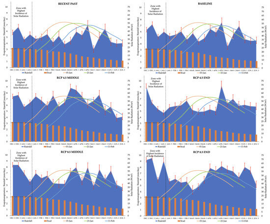 Data presented by the study of [61] were used in elaborating the “RECENT PAST” scenario. Ref. [61] reviewed 33 empirical studies on the effects of past climate change in Rio Grande do Sul and identified changes of 1.8 °C and −0.3 °C in Summer, 1.4 °C and 0.6 °C in Autumn, 0.6 °C and 0.3 °C in Winter, and 1.5 °C and 0.5 °C in Spring in the minimum and maximum temperature, respectively. In addition, rainfall changed to +48 mm during the Summer, +105 mm in the Autumn, +3 mm in the Winter, and +98 mm in the Spring. The reported changes in and occurred between 1950 and 2010, while, in , they occurred between 1936 and 2000. Such values were added to or subtracted from the daily data collected from the weather station in the Baseline scenario. For the variable, the same values as for the Baseline scenario were used.