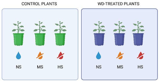 Basil (Ocimum basilicum L.) seedlings of uniform size were obtained from a local nursery (2 week growing period from the sowing of the seeds) and transplanted individually into black plastic pots, each containing 120 g of a commercial growing medium (VigorPlant Italia srl, Fombio, Italy). The experimental design included two primary treatments: control (C, leaves sprayed weekly with water) and wood distillate (WD, leaves sprayed weekly with 0.2% WD). Wood distillate characteristics are reported in Fedeli et al. [24]. The choice of a 0.2% concentration was chosen based on previous literature articles [24,25]. Higher concentrations (>0.2%) have the potential to induce phytotoxic effects, as observed in several articles, while lower concentrations may not provide sufficient physiological benefits. This specific concentration was selected to ensure optimal plant response without causing stress or adverse side effects. Additionally, foliar application at this level allows for the efficient absorption of bioactive compounds while avoiding excessive accumulation that could interfere with normal leaf physiology. Each treatment was further divided into three levels of stress by water deficiency (Figure 1): no stress (NS, irrigation at 70% of water holding capacity—WHC), moderate stress (MS, irrigation at 50% of WHC), and high stress (HS, irrigation at 30% of WHC). Soil moisture levels were maintained throughout the six-week experimental period by weighing each pot daily and adjusting the water input to match the designated drought stress levels.