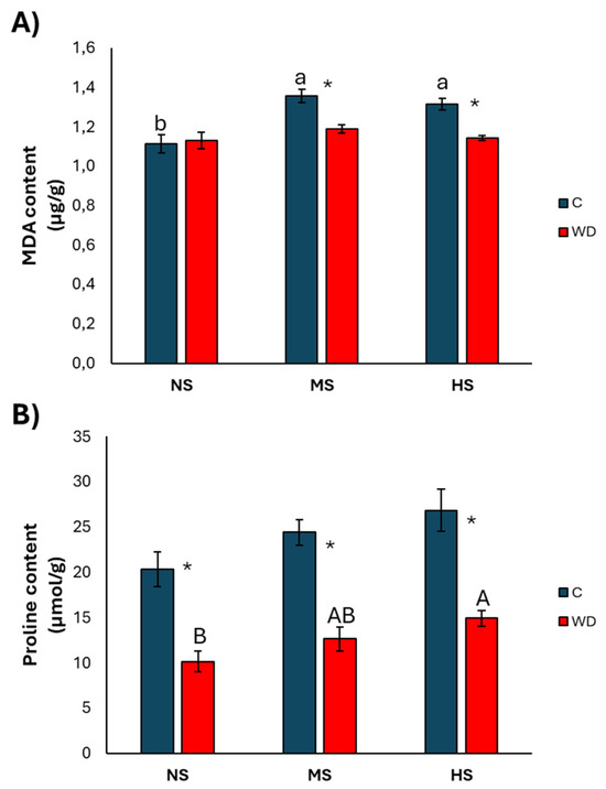 Malondialdehyde (MDA) content (A) and proline content (B) of basil (mean ± standard error). NS = no stress; MS = medium stress; HS = high stress. C = control plants; WD = wood distillate. Different letters (lowercase for C and uppercase for WD) indicate significant differences between the same treatment; * indicates the significant differences (p ≤ 0.05) in pairs relative to the same treatment.