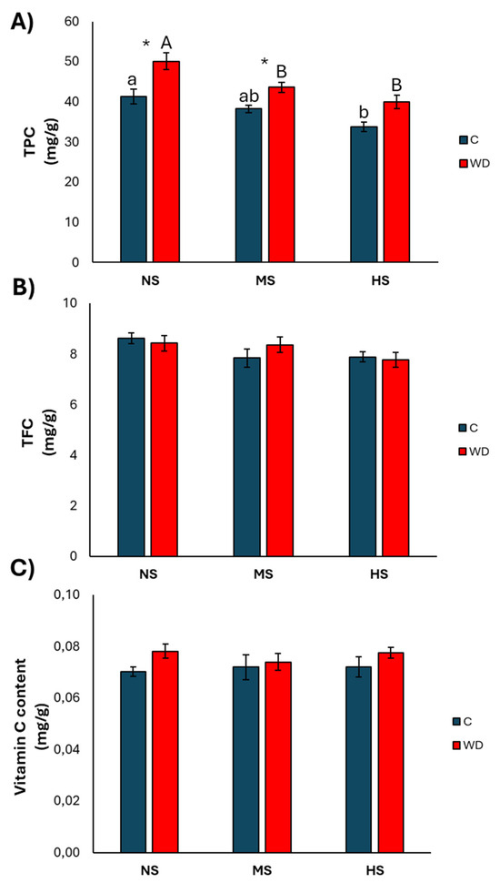 Total polyphenol content (TPC) (A), total flavonoid content (TFC) (B), and vitamin C content (C) of basil (mean ± standard error). NS = no stress; MS = medium stress; HS = high stress. C = control plants; WD = wood distillate. Different letters (lowercase for C and uppercase for WD) indicate significant differences between the same treatment; * indicates the significant differences (p ≤ 0.05) in pairs relative to the same treatment.
