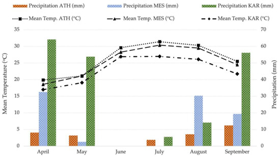 The automatic weather station of the Agricultural University of Athens (Davis Vantage Pro2 Weather Station; Davis Instruments Corporation, Hayward, CA, USA) provided the average monthly air temperature and rainfall data for the ATH experimental site, which are shown in Figure 1. The automated weather stations of the Institute for Environmental Research, National Observatory of Athens [33], which are situated 5–10 km from each experimental trial, provided the relevant data for the MES and KAR experimental sites during the corresponding growing period (Figure 1). Between April and September 2024, the average air temperature was 26.3 °C in ATH, 25.4 °C in MES, and 23.0 °C in KAR. At the same time, the total precipitation was 38, 85, and 194 mm in ATH, MES, and KAR, respectively.