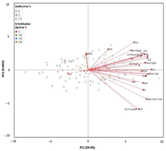 The principal component analysis (PCA) clarified 64.09% of the total variability, as presented in Figure 2. PC1 (54.4%) clarified the greatest amount of variation by distinguishing between the untreated plots of the two examined factors under study and the N fertilizer application at a level of 100 kg N ha−1 (on the negative site) and the zeolite addition treatments at amounts of 5 and 7.5 t ha−1, along with N fertilizer at levels of 150 and 200 kg N ha−1 (on the positive side). By separating the zeolite addition at amounts of 5 and 7.5 t ha−1 and N fertilizer application at levels of 150 and 200 kg N ha−1 (on the positive side) from the untreated plots of the two examined factors and N fertilizer at a level of 100 kg N ha−1 (on the negative side), PC2 demonstrated 9.69% of the total variance. The upper-right quadrant contained the N fertilizer application at 150 and 200 kg N ha−1 and the zeolite addition treatments at 5 and 7.5 t ha−1, which were more correlated with LAI, dry weight, plant height, ELG, SF, RLD, STR, MIC, lint percentage, boll weight, TrAr and TrID. In addition, N fertilizer at a level of 100 kg N ha−1 and the controls of the two examined factors were observed in the low-left quarter and showed no association with the examined variables.