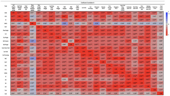 In the present study, lint percentage, MIC, MAT, STR, and ELG all showed positive relations (Figure 3). Additionally, UHML and UI (r = 0.726, p < 0.001), as well as ELG and SFI (r = 0.549, p < 0.001), showed favorable associations (Figure 3). The positive correlations recorded highlight the simultaneous effect of the examined factors on the development and fiber quality of cotton.