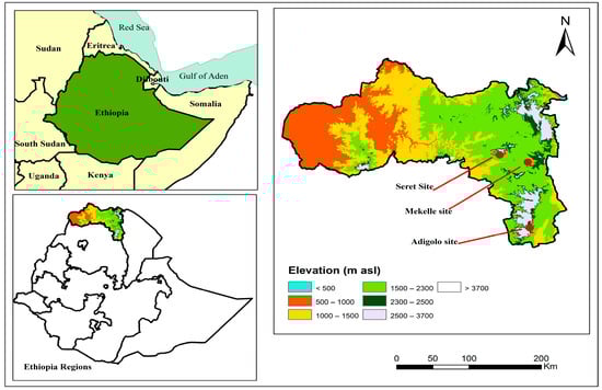 This study was conducted on farmers’ plots at three locations in Tigray, northern Ethiopia, during the growing period (July to November) of two years, 2019 and 2020. These locations are Seret (13°34′49″ N and 39°7′58″ E), Adigolo (12°32′20″ N and 39°30′48″ E), and Mekelle (13°28′43″ N and 39°29′24″ E) (Figure 1). The Mekelle site is approximately 2100 m above sea level (asl) while the other two sites are about 2400 m asl (Figure 1). All study sites have mixed crop–livestock farming systems. Cereal crops such as wheat, barley, teff, and maize were dominantly cultivated in the sites. Pulses like faba beans, peas, and lentils are also grown.