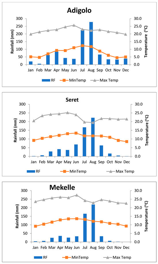 Mekelle and Seret are dry from September to May and rainy and wet from July to August. Adigolo has bimodal rainfall with the main rainy season from July to September and short rains from February to April. Based on metrological data collected (2000–2020), the mean annual rainfall at the Mekelle site was about 618 mm, 760 mm at Seret, and 902 mm at Adigolo (Figure 2). The maximum and minimum temperatures range from 26 to 10 °C at the Mekelle site, 25 to 10 °C at Seret, and 23 to 8 °C at Adigolo. Rainfall distribution was not uniform in the growing season across sites. Before the experiment started in 2019, barley and teff were grown at the Mekelle and Seret sites, while maize and wheat were cultivated in Adigolo.