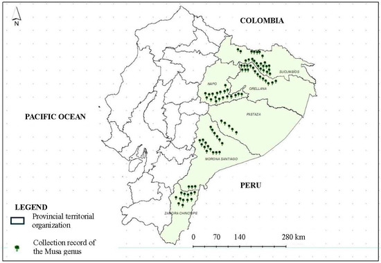 Consequently, this research aimed to study the agro-morphological and ecogeographical diversity of the 100 accessions in the National Musa Collection collected in the six provinces of the Amazon region of Ecuador in 2014, following the protocol of Monteros-Altamirano et al. [25], thus contributing to their conservation and the sustainable management of the priority crop in Ecuador by identifying materials with tolerance to abiotic stress and the climatic, edaphic, and geophysical factors of the sampling areas. Given their strategic value, it was necessary to conduct morphological characterization to identify materials with potential for genetic improvement programs, as well as ecogeographical characterization to allow for planning future collections in areas not yet represented in the preserved collection.