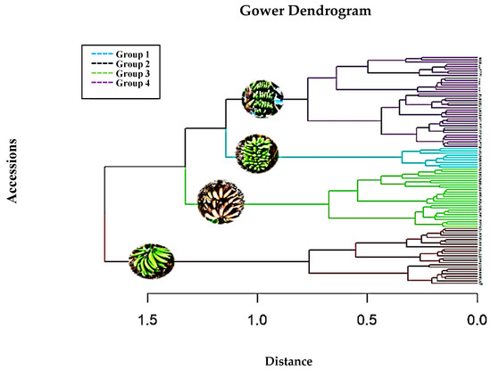 Dendrogram obtained using hierarchical cluster analysis (Ward’s method and Gower’s distance) based on the qualitative and quantitative morphological descriptors of 100 Musa accessions. Group 1 (Musa AAB “Hartón Plantain” and “Cuerno Clone”), Group 2 (Musa acuminata “Orito”), Group 3 (Musa acuminata “Malay” and “Red Banana”), and Group 4 (Musa paradisiaca “Barraganete” and AAB “Dominican Plantain”).