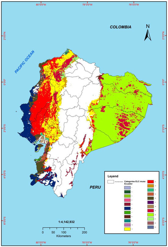 For example, in Iowa, USA, these types of maps were used to determine crop capacity. In contrast, Tapia et al. [28] reported that the ELC map identified non-homogeneous adaptive scenarios, which were classified into 24 ecogeographic categories for the biodiversity of the genus Musa, finding low-frequency categories that share only specific characteristics in their climatic, geophysical, or edaphic components with the high-frequency categories. The ELC map allowed us to correctly discriminate adaptive scenarios using key ecogeographic variables, which directly influence the abiotic adaptation of the Musa genus and, therefore, determine its distribution. This approach is crucial for the efficient collection, conservation, and utilization of plant genetic resources.
