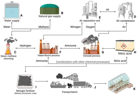Flowchart of conventional fossil-based nitrogen fertilizer production. (A) Water fed to the steam methane reforming process facility. (B) Methane fed to the steam methane reforming process facility. (C) Steam methane reforming processes facility. (D) Air from the air compressor unit fed to the air separation unit and to the Ostwald process. (E) Nitrogen fed to the Haber-Bosch process and oxygen fed to the Ostwald process from the air separation unit. (F) Haber-Bosch process facility feeding ammonia to the Ostwald process facility. (G) Ostwald process facility. (H) Nitric acid produced from the Ostwald process. (I) Nitrogen fertilizer produced with nitric acid and ammonia from the Haber-Bosch process along with other chemical processes. (J) Transportation of fertilizers via ships, rail, and trucks. (K) Final destination of nitrogen fertilizers (greenhouses). The arrow tips on the lines indicate the direction of flow and input to a process. The white circles at the end of lines represent an output from a process, indicating where the flow continues or exits the system. Dashed lines represent the combination of products with other chemical processes (e.g., ammonia and nitric acid combined with additional non-represented chemical processes to produce nitrogen fertilizer).