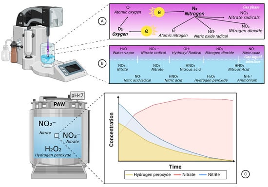 Formation of PAW components through jet plasma and post-discharge physicochemical changes during storage. (A) Electron–molecule collisions in the plasma beam, ambient air serves as the input gas. (B) Gas–liquid interface, where the plasma interacts with water, generating reactive oxygen and nitrogen species. (C) Physicochemical changes in three main components of PAW during storage.