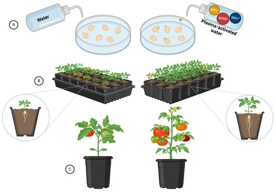 Effect of PAW on tomato plant growth. (A) Seed germination differences between the control group and PAW-treated seeds. (B) Differences in seedling vigor, uniformity, and root growth between the control and PAW-treated groups. (C) Differences in plant growth, yield quantity and quality between the control and PAW-treated groups.