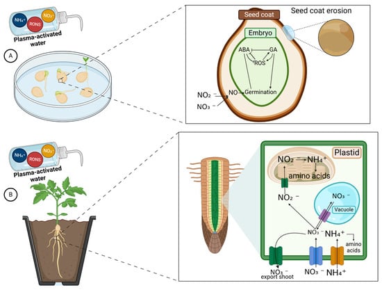 Reactive oxygen and nitrogen species regulate phytohormone levels, triggering metabolism that influences seed germination [68]. Seed dormancy and germination depend on gibberellic acid and abscisic acid [71,72,73]. Gibberellic acid promotes germination by activating α-amylase, which remobilizes energy substrates, while abscisic acid maintains dormancy. Reactive oxygen and nitrogen species promote germination by degrading abscisic acid and enhancing gibberellic acid biosynthesis (Figure 4A) [74]. PAW enhances dormancy release through hormonal modulation, increased seed coat permeability, and enhanced water uptake [75]. Moderate reactive oxygen species levels act as signaling molecules for germination, while excessive levels cause oxidative stress. Reactive nitrogen species support plant nutrition and redox regulation, aiding the synthesis of amino acids, proteins, and chlorophyll (Figure 4B) [68]. The germination process involves three stages: water absorption, metabolic activation, and radicle protrusion. Reactive oxygen species trigger transduction events related to seed germination, while reactive nitrogen species regulate redox status and synthesis of biomolecules [34].