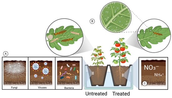 Comparison of the benefits of PAW application in crop production. (A) Presence of pathogens in untreated plants. (B) Pest infestation in untreated plants, with a reduction in pest populations in PAW-treated plants, attributed to increased trichome density. (C) PAW as a fertilizer enhancer, promoting plant growth and overall health.