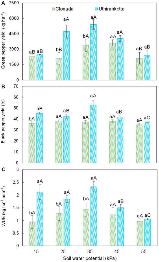 Green pepper yield (A), black pepper yield (B), and water-use efficiency (C) of two black pepper cultivars (Clonada and Uthirankotta) cultivated under five soil water potentials. Different capital letters indicate statistical differences among soil water potentials within the same cultivar. Different lowercase letters denote statistical differences between cultivars at the same soil water potential. Means comparison was accomplished by the Tukey test (p > 0.05).