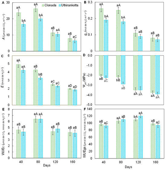 Intrinsic water-use efficiency (WUEi) (Figure 2F) increased over time for both cultivars. In Clonada, WUEi was highest at 160 days (100 µmol CO2 mmol−1 H2O) and lowest at 40 days (80 µmol CO2 mmol−1 H2O). A significant increase was observed over the period of evaluation. In Uthirankotta, WUEi followed a similar pattern, increasing from 40 days (70 µmol CO2 mmol−1 H2O) to 160 days (90 µmol CO2 mmol−1 H2O). Uthirankotta showed consistently lower WUEi as compared to Clonada, with statistical differences at all time points except 160 days.