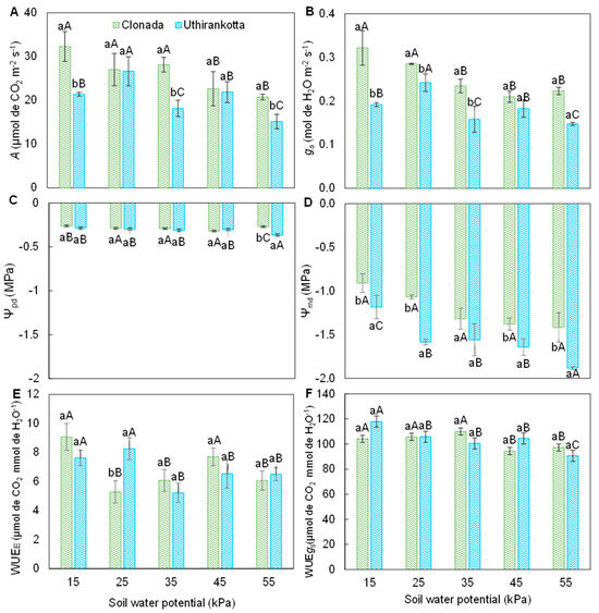 Net CO2 assimilation rate (A), stomatal conductance (B), predawn water potential (C), midday water potential (D), instantaneous water-use efficiency (E), and intrinsic water-use efficiency (F) of two black pepper cultivars (Clonada and Uthirankotta) cultivated under five soil water potentials. Different capital letters indicate statistical differences among soil water potentials within the same cultivar. Different lowercase letters denote statistical differences between cultivars at the same soil water potential. Means comparison was accomplished by the Tukey test (p > 0.05).