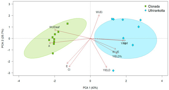 The clustering indicates that Clonada is primarily associated with physiological traits such as net CO2 assimilation rate (A), transpiration rate (E), and stomatal conductance (gₛ). The arrow directions (A, E, WUEleaf, and Ci) show that these variables significantly drive the separation of Clonada along PC1. On the other hand, Uthirankotta is closely associated with traits related to yield (YIELD), water-use efficiency (WUE), and percent yield (YIELD%). These variables contribute to the separation of Uthirankotta from Clonada along PC1, as indicated by the arrows pointing in the positive PC1 direction.