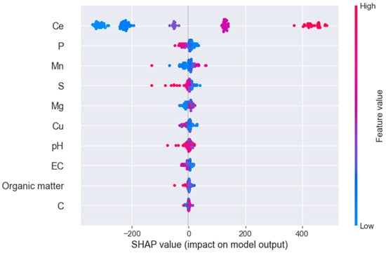 Feature selection on the feature-augmented dataset using RFE identified nine soil variables as important, as shown in Figure 1. An XGBoost model was then trained on the same dataset, using P adsorption as the target variable, and including the P equilibrium concentration (Ce) as an additional input feature. The feature importance plot, which was generated using SHAP, indicated that, aside from Ce, the most influential features were Olsen P, manganese, sand content, and magnesium concentration in the soil (Figure 1).