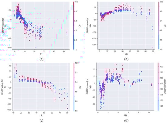 The SHAP dependence plot revealed a clear decline in P adsorption with increasing initial Olsen P concentrations, which aligns with agronomic expectations regarding P availability. However, the strength and consistency of this relationship across equilibrium concentrations was notable, especially since, to our knowledge, no previous studies have explicitly quantified this decline using nonlinear machine learning models while simultaneously accounting for other soil variables (Figure 2a). In contrast, P sorption capacity increased with higher manganese availability in the soil (Figure 2b), while it decreased with increasing sand content (Figure 2c). The positive correlation between manganese availability and P sorption capacity can likely be attributed to both indirect and direct mechanisms: manganese availability increases under acidic or reducing conditions, which are also associated with higher P sorption capacity, and Mn oxides themselves are known to directly contribute to P retention in soil through surface adsorption processes []. A similar positive trend was observed for magnesium, which may reflect its higher availability in alkaline soils with high calcium carbonate content, which tend to exhibit elevated P sorption (Figure 2d).