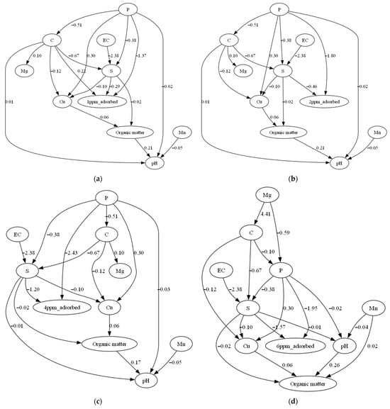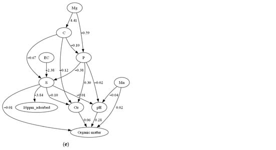 After model training, the Directed Acyclic Graph (DAG) approach was applied on the reduced original dataset (including only the selected features comprising the 147 soil samples) to uncover the causal relationships between variables. For this purpose, the Direct Linear Non-Gaussian Acyclic Model (DirectLiNGAM) was employed. This algorithm is an extension of the original LiNGAM method and offers improved robustness when the assumption of strict non-Gaussianity is not fully met. DirectLiNGAM assumes that the underlying causal structure is linear, acyclic, and free from hidden confounders. While the assumption that the underlying causal structure is linear may limit the model’s ability to capture nonlinear soil and chemical interactions, DirectLiNGAM remains a robust choice for identifying the dominant causal directions in moderate-sized datasets. Additionally, DirectLiNGAM has the advantage of assuming non-Gaussianity in the data, which is critical for enabling the algorithm to detect causal relationships beyond second-order statistical dependencies such as covariance. This allows the model to uncover more complex causal patterns compared to methods based solely on linear Gaussian assumptions. Nonlinear causal discovery algorithms could, in theory, capture richer interactions, but they typically require substantially larger datasets to produce stable and reliable results, which was not feasible in the present study. The DirectLiNGAM algorithm enhances causal discovery by introducing a more reliable method for determining causal order, which involves three main steps: (1) pairwise causality tests, (2) estimation of causal ordering based on those tests, and (3) estimation of connection strengths among variables [,,].