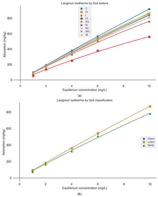 Since sand content emerged as the most significant soil property influencing P sorption capacity, according to both feature importance and causal inference analyses, Langmuir P sorption isotherms were constructed based on soil classification (clay, sand, loam) and soil texture groups (Figure 4a,b). General equations based on soil classification were developed because the original dataset of 147 samples lacked representation from the sandy, sandy clay, and silty texture groups, which are extremely rare in Greek soils. While the fitted Langmuir equations provide reasonable estimates across major soil classes, their applicability to underrepresented texture groups (e.g., sandy, sandy clay, and silty texture groups) may be somewhat limited due to the smaller number of experimental observations. As such, results for these groups should be interpreted with appropriate consideration of this constraint. However, as the extended dataset included some samples from these underrepresented groups, broader Langmuir equations were generated by aggregating samples into three main soil classification groups (sand, clay, and loam), allowing us to estimate P adsorption for all samples through grouped fitting rather than extrapolation from individual texture classes. Figure 4b displays the Langmuir isotherms for the remaining soil texture groups, where it is shown that loamy sand and sandy loam soils have the lowest P adsorptions capacities. This observation is consistent with the feature importance and causal inference analyses, which identified sand content as one of the main drivers reducing P adsorption. Previous studies also have shown that sandy soils typically exhibit lower P adsorption due to their low clay content, iron and aluminum oxides, and limited surface area for sorption reactions [,]. The resulting fitted parameters are presented in Table 3 and Table 4. Table 5, which presents P adsorption percentages across soil types, confirms that clay and silty clay loam soils exhibit the highest adsorption, while sandy textures show the lowest (p < 0.05) across all equilibrium concentrations.