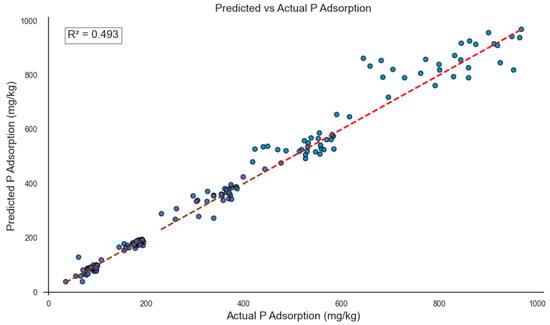 Relationship between actual and predicted P adsorption values using the multi-output XGBoost model on the test set. The model predicts P adsorption at five equilibrium concentrations (Ce = 1, 2, 4, 6, and 10 mg/L) for each of the 30 test samples, resulting in a total of 150 data points. The red dashed line represents the linear regression fit, and the R2 value reflects the model’s overall predictive performance across all outputs.