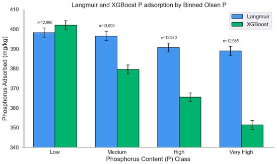 Data from the extended dataset shows that the multi-output XGBoost model is more responsive to variations in initial Olsen P content and sand content in soils compared to the Langmuir isotherms (Figure 7). The XGBoost model is especially sensitive to Olsen P, as it was trained using Olsen P as an input variable, whereas the Langmuir model does not account for this factor. In addition, the XGBoost model demonstrated greater responsiveness to changes in sand content, indicating overall better performance than the Langmuir isotherms. This result is expected given the flexibility of tree-based models to capture non-linear relationships []. However, the novelty of this study lies in incorporating data from diverse soil types during the adsorption experiment, enabling the training of a robust machine learning model that offers an improved solution to the P adsorption prediction problem. The XGBoost model showed high sensitivity to initial Olsen P levels, which was ranked as the most influential feature in the feature importance score, and to sand content. Specifically, P adsorption dropped by 12.6% in the very high Olsen P group compared to the low Olsen P group, which is a substantially stronger effect than observed with the Langmuir model. Similarly, P adsorption decreased by 19.2% in soils with very high sand content compared to those with low sand content, again exceeding the Langmuir model’s sensitivity. These results highlight that machine learning is a more effective approach for predicting soil P adsorption capacity than relying solely on Langmuir isotherms.