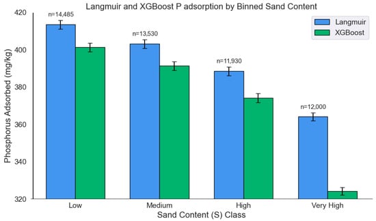 Applying the Langmuir isotherms to the extended dataset revealed a modest decline in P adsorption of 2.3% in the very high Olsen P group compared to the low Olsen P group (p = 0.005) (Figure 6), and an 11.9% reduction in the very high sand content group relative to the low sand group (p < 0.001) (Figure 7). In contrast, the multi-output XGBoost model estimated a substantially greater drop of 12.6% for Olsen P and 19.2% for sand content (both p < 0.001). These results highlight the machine learning model’s enhanced sensitivity to key soil properties, particularly in capturing their nonlinear and interacting effects on P sorption. The Langmuir model’s underestimation is likely due to its simplified functional form, which does not account for such multivariate complexity. These findings underscore the advantage of data-driven approaches like XGBoost in modeling nutrient dynamics across diverse soil conditions. Table 7 presents P adsorption percentages predicted by the multi-output XGBoost model across soil texture classes for the extended dataset. Silty clay loam and silty clay soils generally exhibit among the highest predicted adsorption values, consistent with observations from the original dataset (Table 5), while sandy textures (e.g., sandy loam, sandy) show the lowest, particularly at higher equilibrium concentrations.