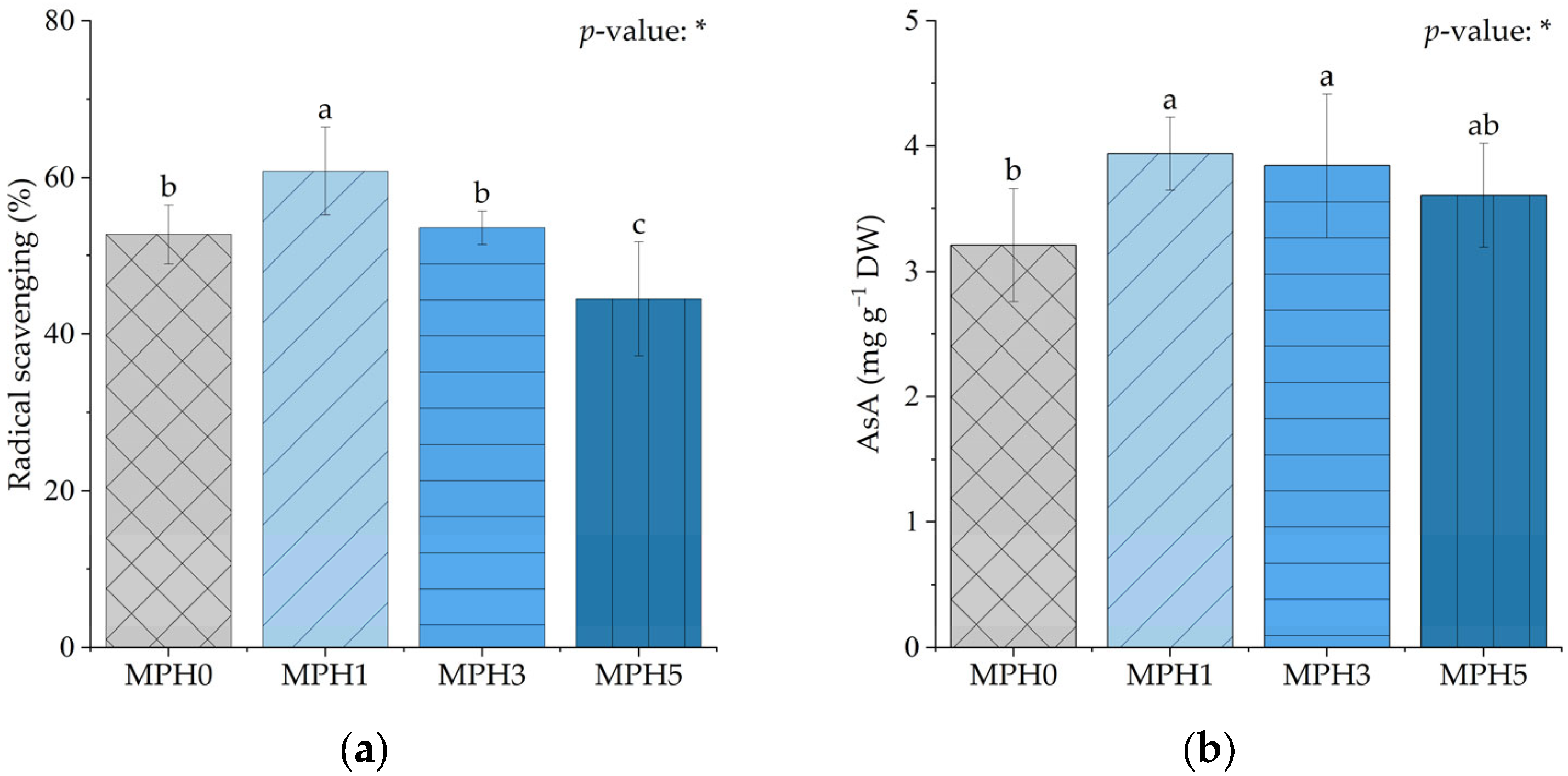 4.3. MPH-Induced Changes in Antioxidant Capacity and Ascorbic Acid Content