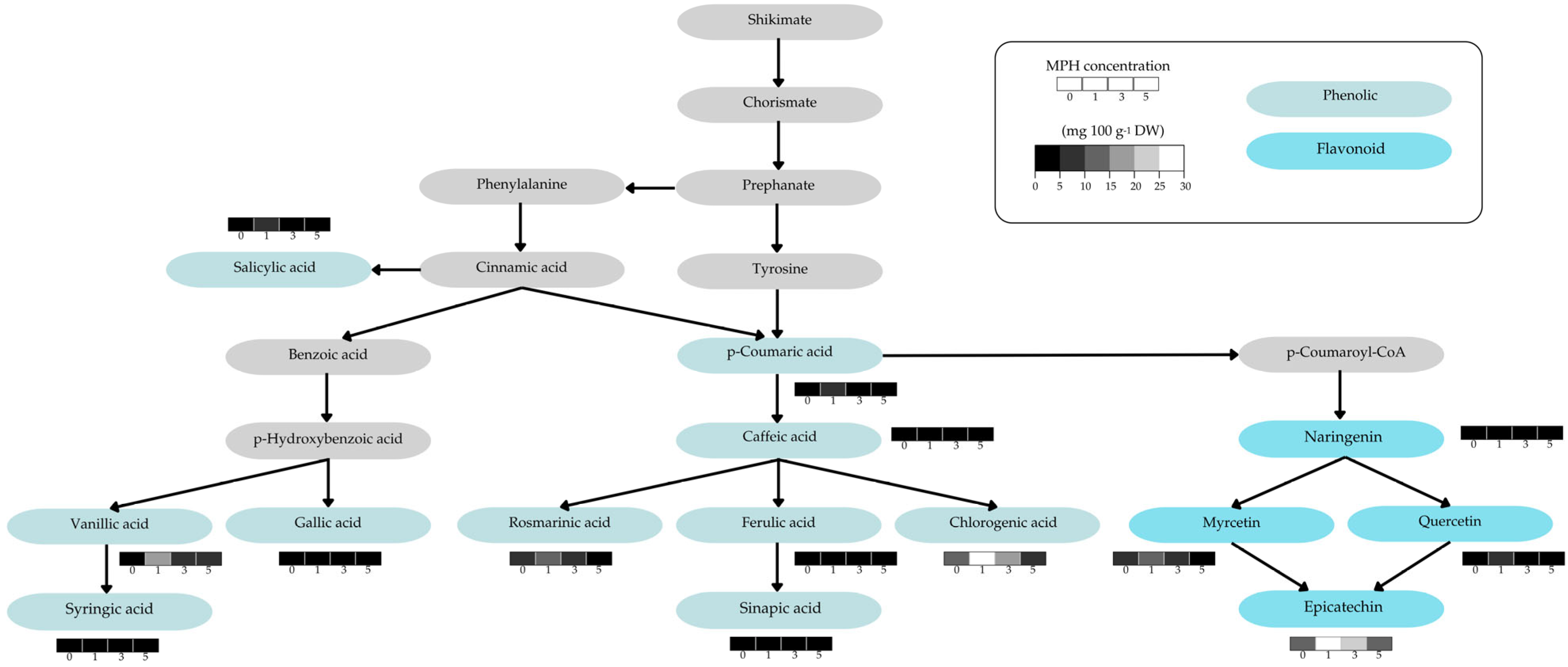 3.4. Effect of MPH on Bioactive Compounds and Phenolic and Flavonoid Content Profiles