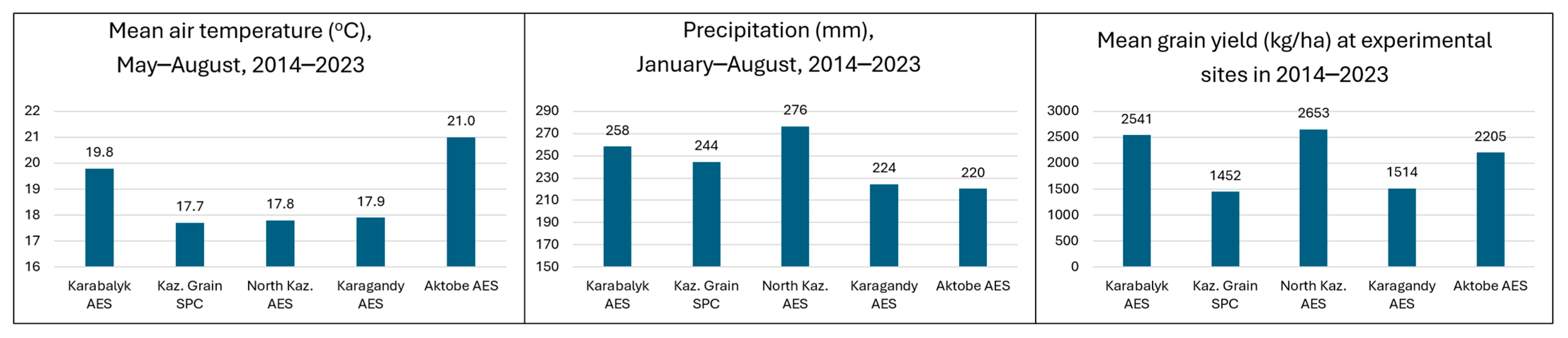 - Kushenbekova, A.K.; Mukhomedyarova, A.S. Productivity of spring wheat varieties depending on climatic conditions of the dry steppe zone of western Kazakhstan. Sci. Edu. 2022, 66, 33–40. [Google Scholar]