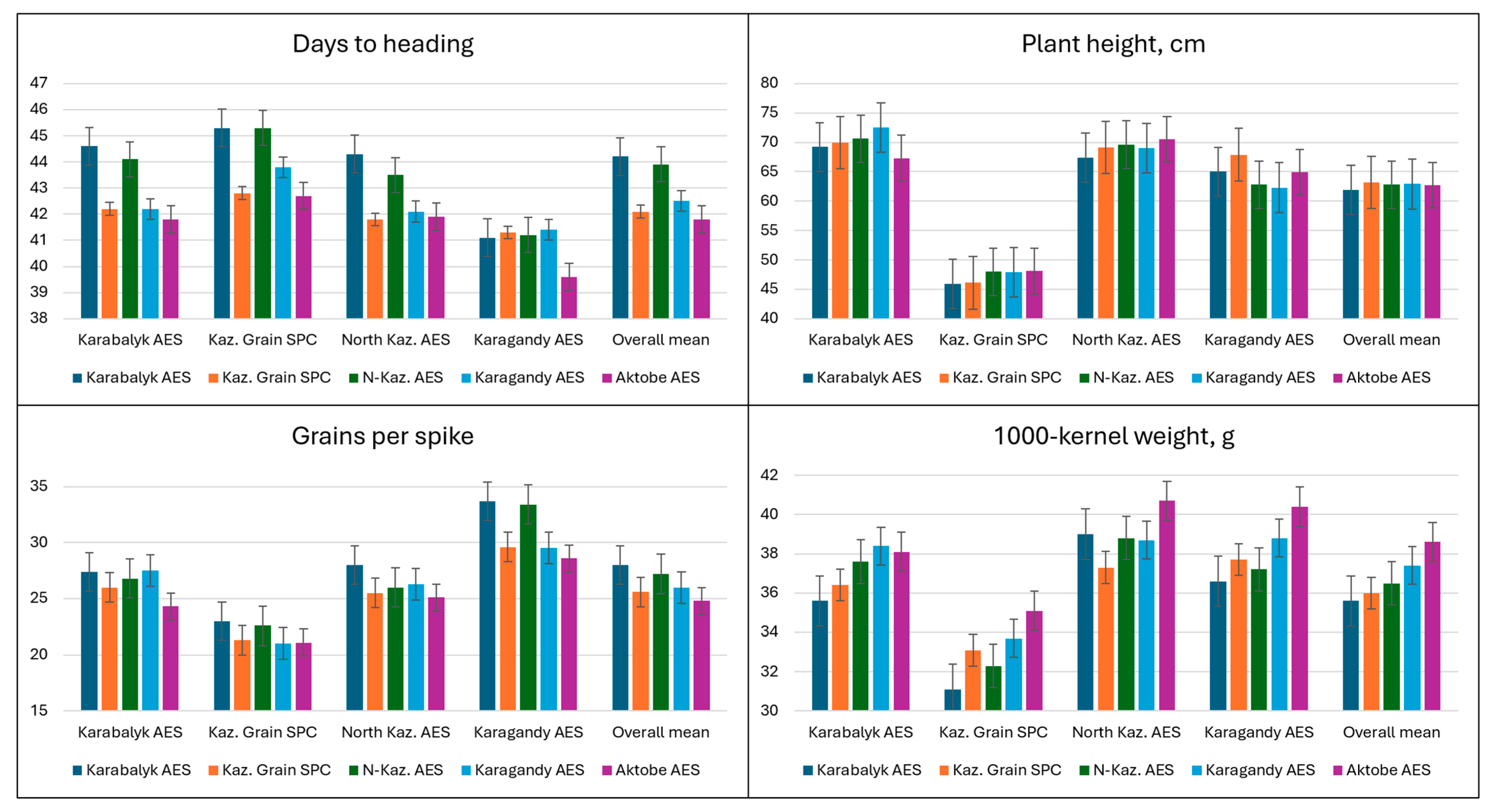 - Aidarbekova, T.J.; Syzdykova, G.T.; Malitskaya, N.V.; Nurgaziyev, R.E.; Husainov, A.T.; Zhabayeva, M.U.; Makhanova, S.K.; Shoykin, O.D. Comparative assessment of spring soft wheat lines (Triticum aestivum L.) in the steppe zone of the north Kazakhstan region. Agric. Biol. 2022, 57, 66–80. [Google Scholar] [CrossRef]