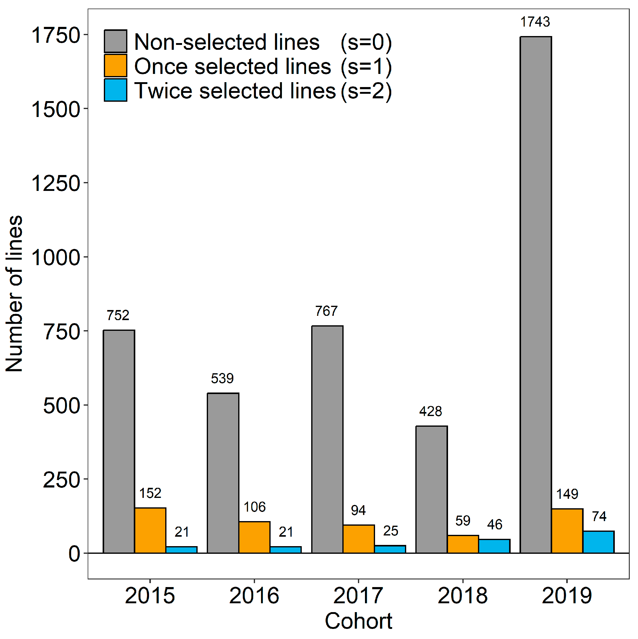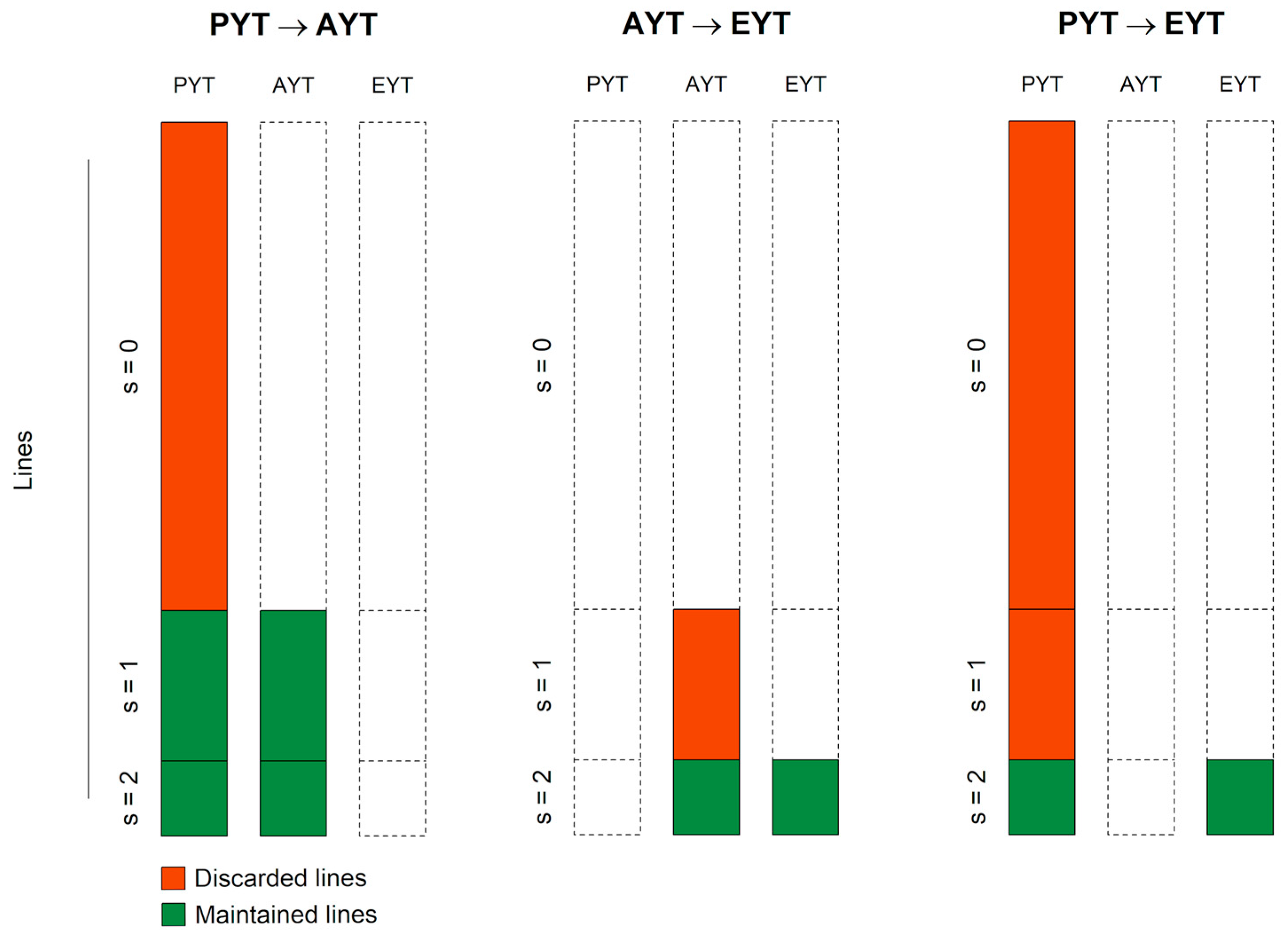 - Selection decisions concerning all lines tested in s and the subset of twice-selected lines () that finally entered s after passing s , with a classification of non-selected lines () as well as lines that were selected once ( versus lines that were selected twice ().