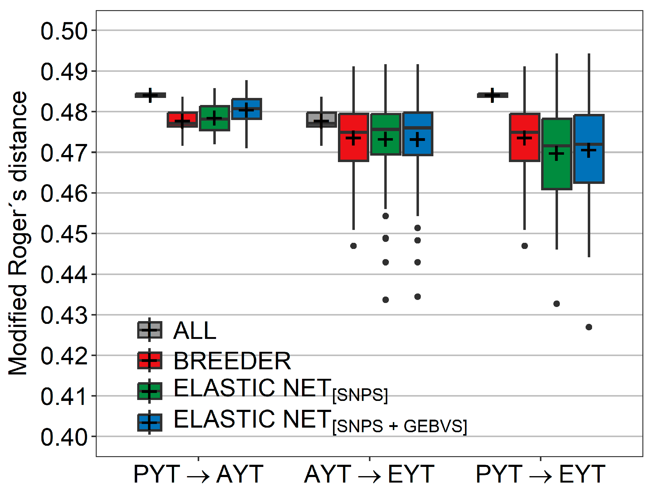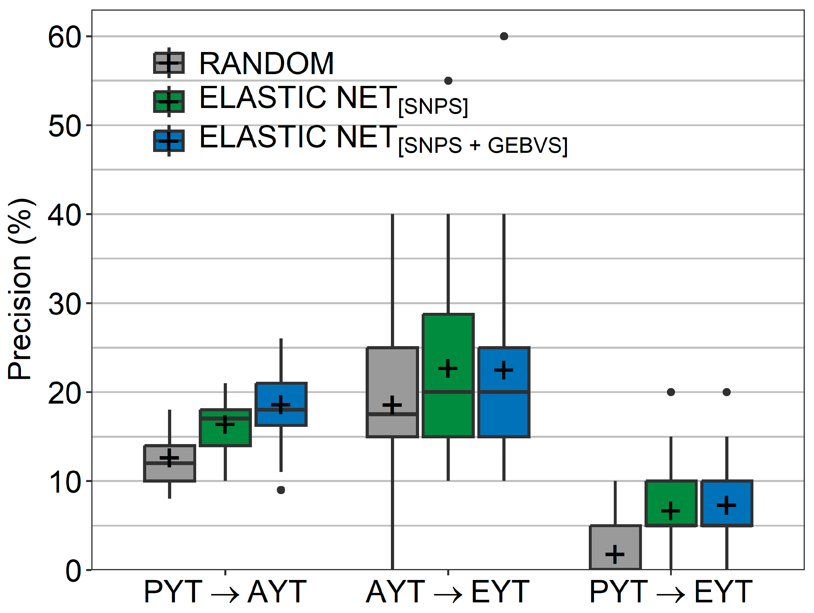 - The precision of this classification into ‘maintained’ and ‘discarded’ lines in the different selection schemes was finally estimated by:where is the number of true positive- and is the number of false positive-classified lines in the validation population based on a confusion matrix. refers to lines that were predicted as being ‘maintained’ and were actually selected by the breeder, whereas refers to lines that were wrongly classified by elastic net as falling into the class of ‘maintained’ lines. The precision was lastly compared to a random choice from among the lines in the validation population in the above-outlined scenarios.