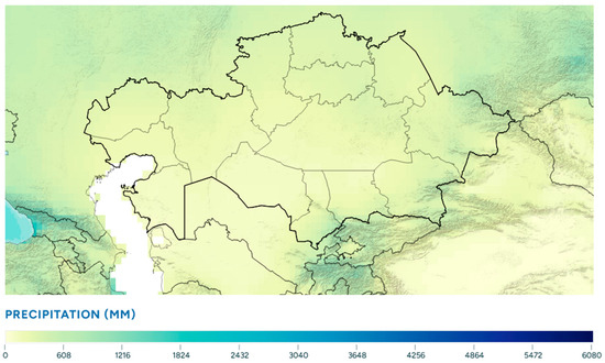 According to data from climate maps of the Republic of Kazakhstan [31], which show the distribution of average annual temperature and precipitation, the southeastern and southern regions of Kazakhstan (Almaty, Zhambyl, and Turkestan) experienced average annual temperature variations from 7.0 to 13.0 °C (Figure 1) and annual precipitation between 250 and 600 mm (Figure 2) during the period from 1991 to 2020 [35].
