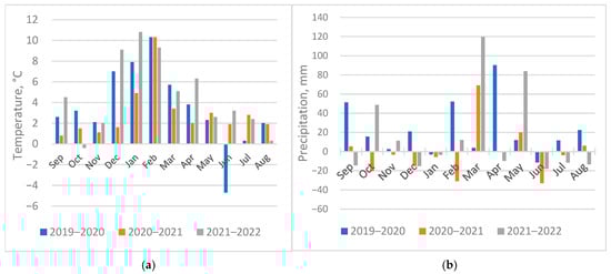 Analysis of the meteorological conditions during three growing seasons (2019–2021, 2021–2022, and 2022–2023) in terms of temperature and precipitation showed the following: