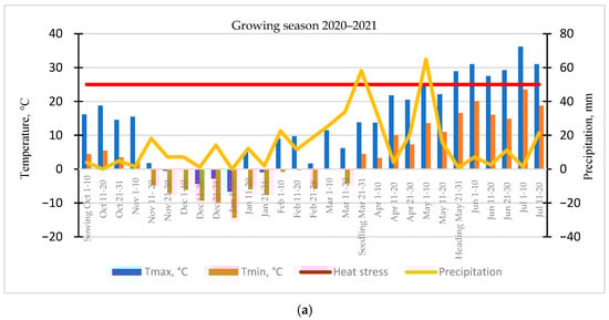 This led to a decrease in (a) plant height by more than 30.0 cm and (b) yield by 72.3%. Under the drought conditions of 2020–2021, a heat stress threshold temperature (>+25 °C) was established. The sustained increase in temperature was reflected in the high accumulation of heat degree days (34.2 °C HDD) during the maturity period, which had a direct impact on wheat yield.