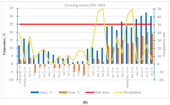 The increase in the frequency of droughts and heat stress has a direct impact on wheat yields. Wheat is sensitive to temperature conditions at different stages of development, with optimal temperature ranges for growth (16–22 °C), flowering (12–22 °C), and ripening (21–25 °C) [43,44,45]. Meteorological conditions throughout the growing season have a significant impact on the formation of winter crop yields, with the most sensitive phases being heading and flowering as well as grain filling. Temperatures above 25 °C, especially during flowering and grain filling, can lead to heat stress, which disrupts the physiological processes of pollination and grain formation [44,46,47,48,49,50,51].