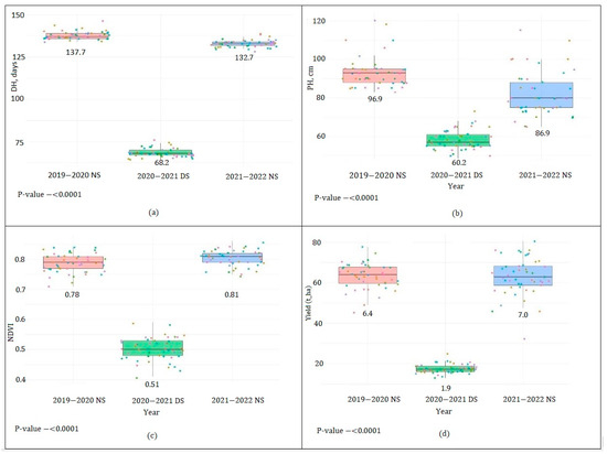 Low drought index (DI) values also confirmed the pronounced depressing effect of drought: 0.63 (DI PH); 0.63 (DI NDVI); 0.50 (DI DH); 0.27 (DI Yield). The NDVI vegetation index, widely used to assess vegetation condition and predict crop yields [61], also showed a decrease from 0.78 to 0.81 (2020, 2022) to 0.51 (2021), confirming the predictive value of NDVI, which is a sensitive indicator of plant response to agrometeorological conditions during a specific growing season. Strong positive correlations between the NDVI, growth indicators, and yield confirmed their value as stress indicators. This confirms that drought during critical phases of plant development significantly limits the realization of crop production potential.