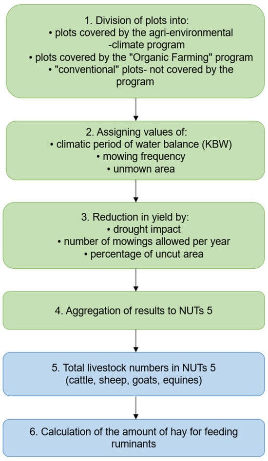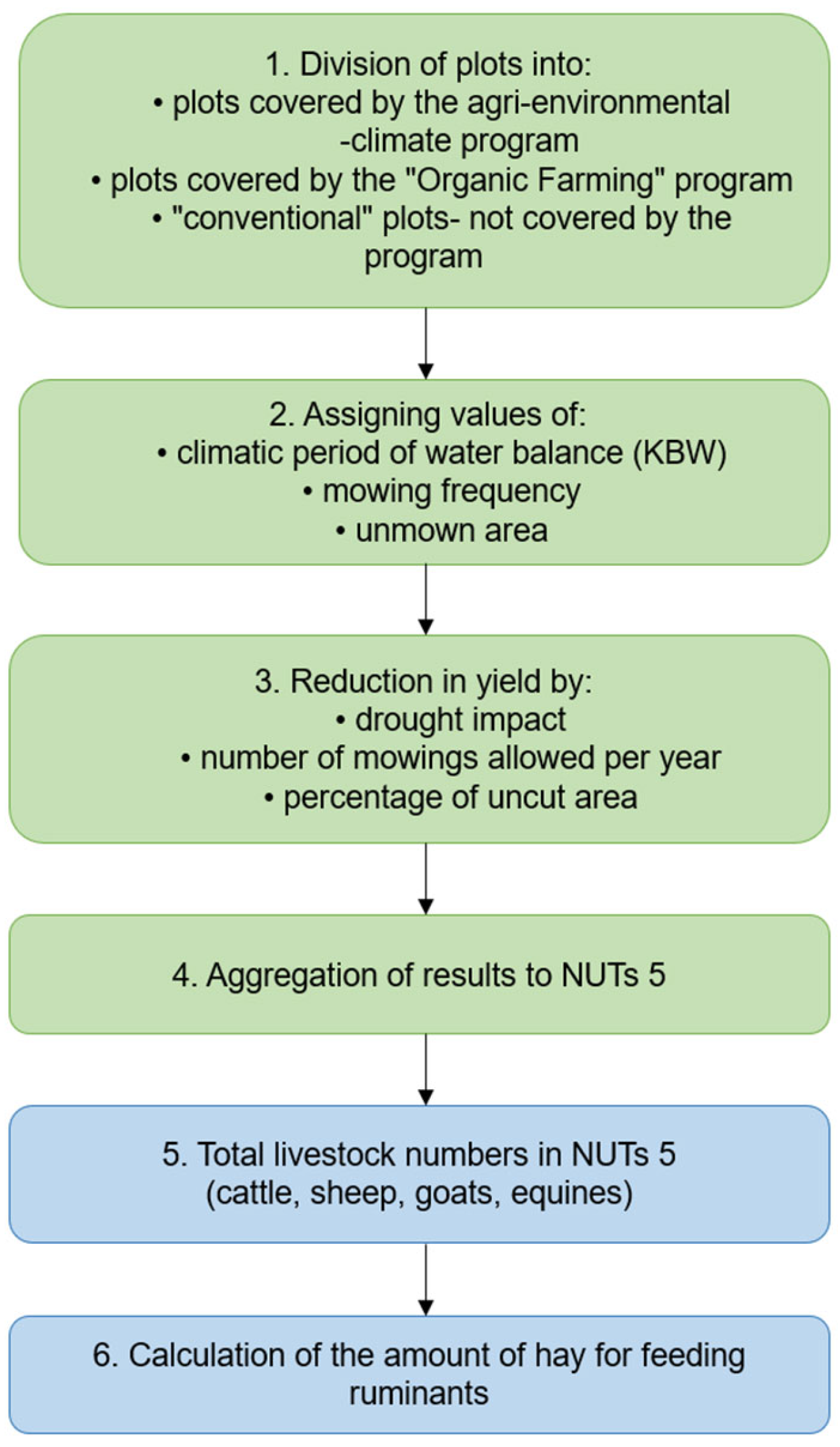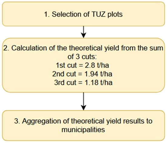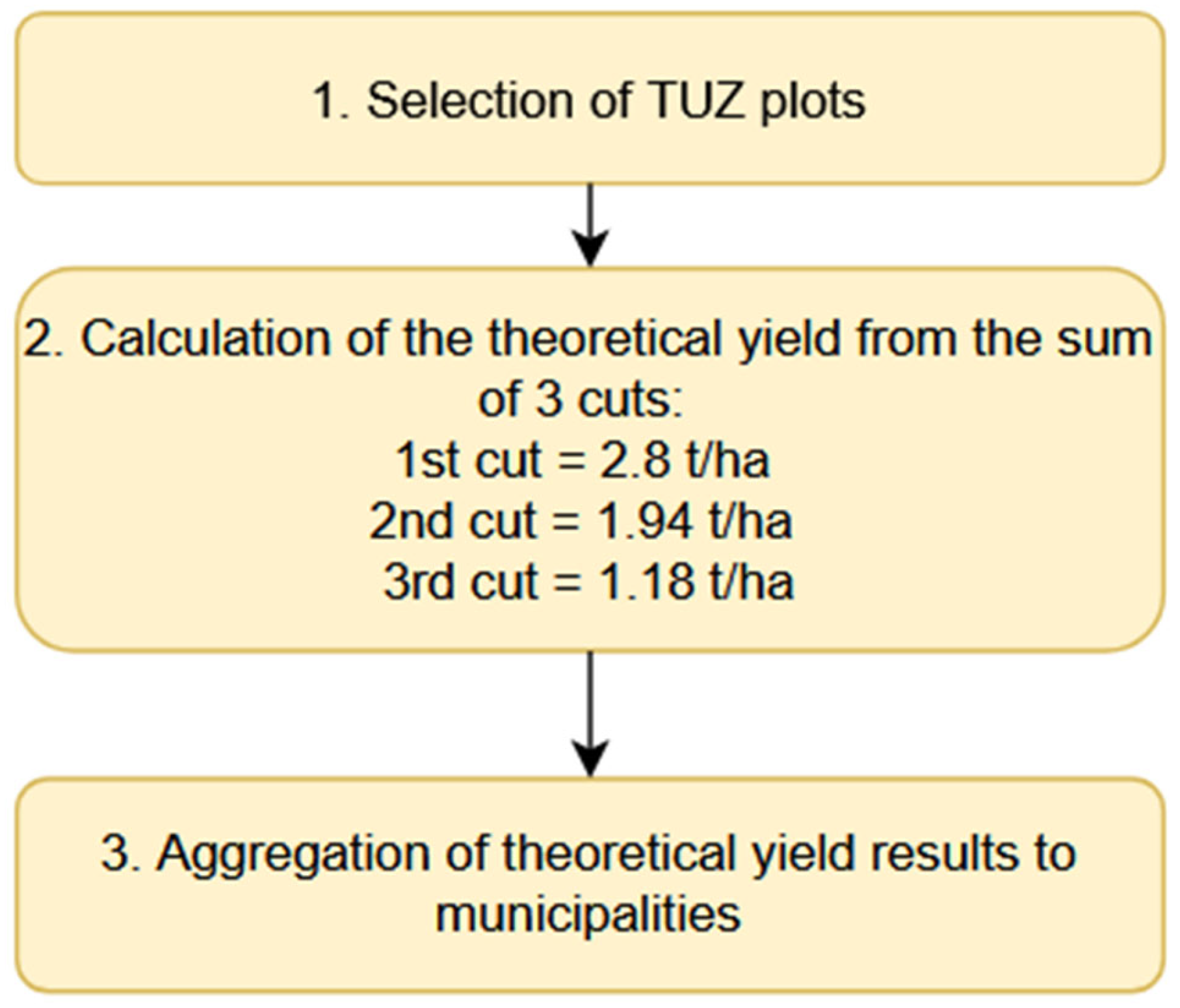 After all corrections, final yields were calculated for each plot and aggregated to the municipal level, enabling analysis in an administrative context. The aggregated results also allowed for the estimation of hay biomass surpluses, taking into account the quantities required for livestock feeding []. The entire process is illustrated in the block diagram (Figure 2).
