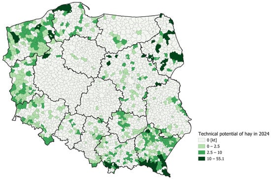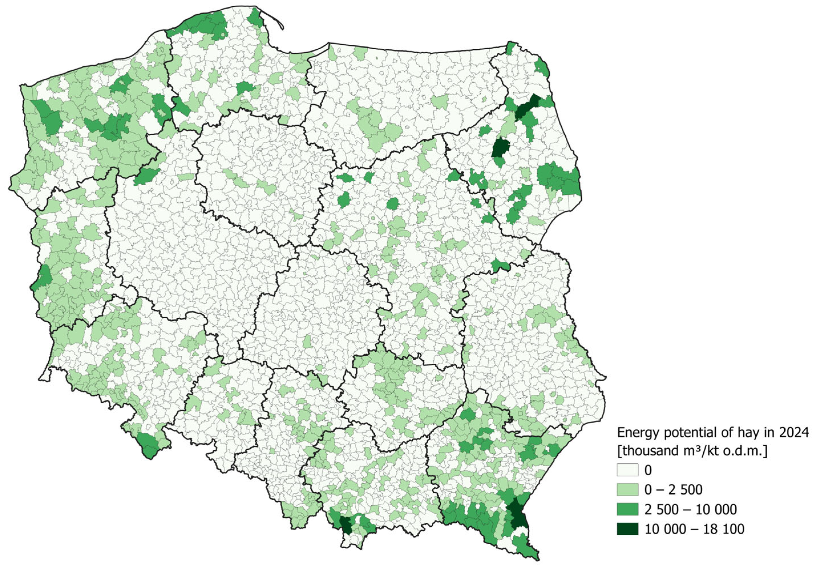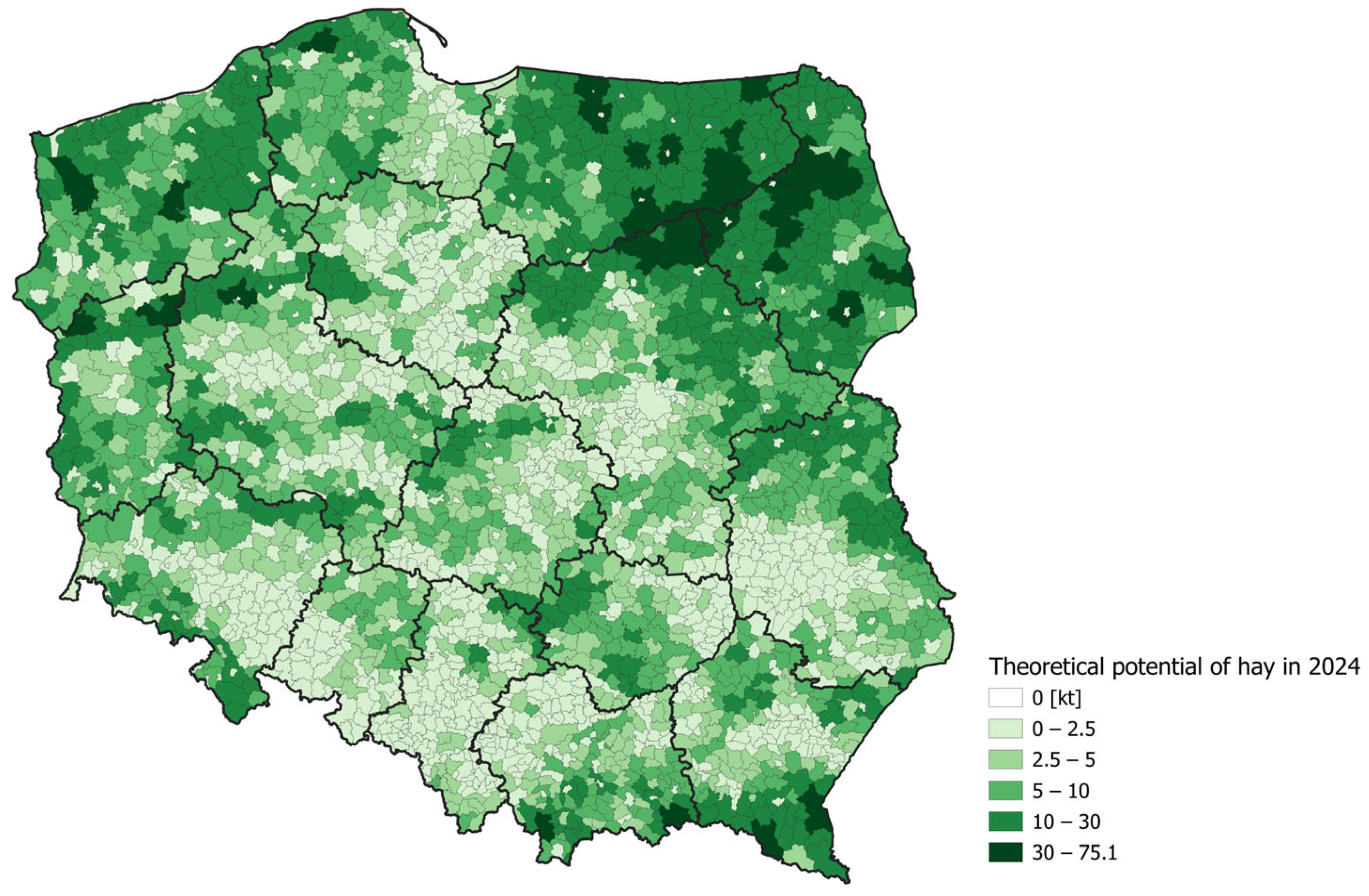 The present study quantified the theoretical and technical potential of hay biomass from TUZ in Poland for the year 2024. The total theoretical potential was estimated at over 15 million tonnes, with the highest contributions identified in Mazowieckie and Podlaskie voivodeships. However, when local livestock demand was incorporated into the assessment of technical potential, surpluses proved limited across most municipalities. Only in specific regions, such as Podkarpackie and selected areas of western and southern Poland, were positive municipal-level balances identified, indicating potential availability of hay biomass beyond agricultural use.