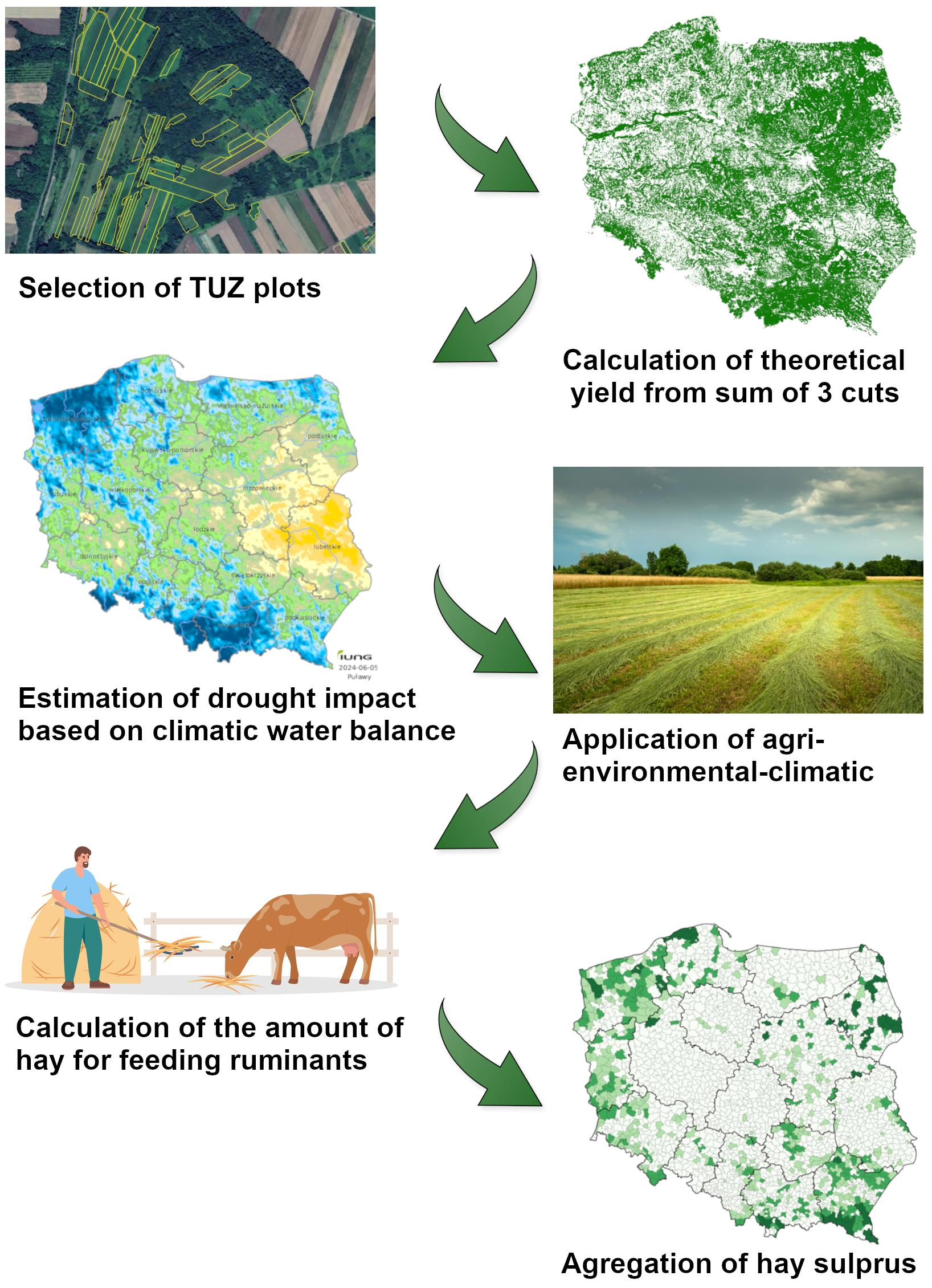 This study presents a comprehensive methodology for assessing the technical potential of hay biomass from permanent grasslands (TUZ) in Poland, aimed at evaluating its energy use possibilities. This research was based on detailed data from the Agency for Restructuring and Modernization of Agriculture (ARiMR) and included both environmentally subsidized and non-subsidized parcels. Using statistical hay yield values adjusted for drought impacts through the Climatic Water Balance (KBW), a realistic estimation of technical hay potential was obtained. Results show a total theoretical hay potential of 15 million tonnes in 2024. The results indicate that the total theoretical hay potential in the country in 2024 amounted to 15 million tons, but its technical potential is reduced to almost zero. The methane productivity of this biomass could generate 3.5 Mt CH4 (at STP) if most of it could not be used for animal feeding purposes. The findings highlight the underutilized energetic potential of grasslands and the critical role of land use policy in unlocking sustainable bioenergy resources. Research into the potential of biomass is important in view of supporting energy independence, sustainable use of agricultural resources and agroecological synergy by combining production, energy and environmental objectives. It should be remembered that biomass potential studies are subject to limitations resulting from the uncertainty of statistical data, variability of climatic and soil conditions and model assumptions, which may affect the accuracy and comparability of the obtained results.