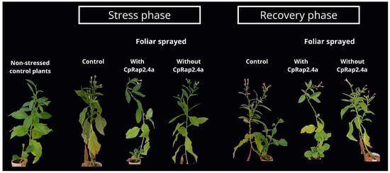 Phenotypic effect of exogenous application of CpRap2.4a in tobacco plants under heat stress and recovery. Plants under optimal growth conditions (without stress) are at the left of the figure. Plants subjected to 14 days of high temperature stress were compared with those plants after 14 days of recovery. Control plants were sprayed with empty vector supernatant (protein extract without the induction of CpRap2.4a (without CrRap2.4a)), and plants were sprayed with supernatant containing the recombinant CpRap2.4a protein. Plants treated with CpRap2.4a displayed a noticeably more vigorous phenotype under stress and a superior recovery capacity compared to the control and empty vector groups.