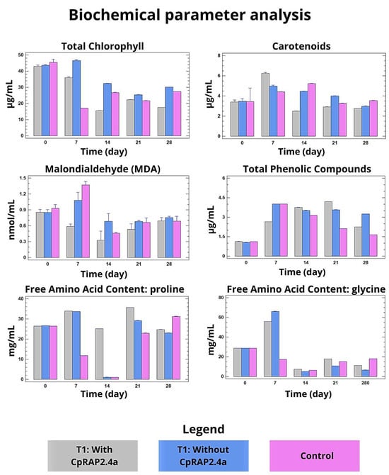 At the biochemical level, treatment with CpRap2.4a helped maintain cellular integrity. Total chlorophyll and carotenoid content was less reduced in treated plants, reflecting less damage to the photosynthetic apparatus (Figure 3 upper graphs). In parallel, oxidative stress, quantified by malondialdehyde (MDA) levels, was significantly lower in the group sprayed with CpRap2.4a, suggesting less lipid peroxidation of membranes (Figure 2 middle graphs). Furthermore, treated plants showed an increase in the concentration of total phenolic compounds and free amino acids such as glycine, indicating a potential activation of antioxidant and osmoprotection mechanisms (Figure 2, middle and lower graphs).