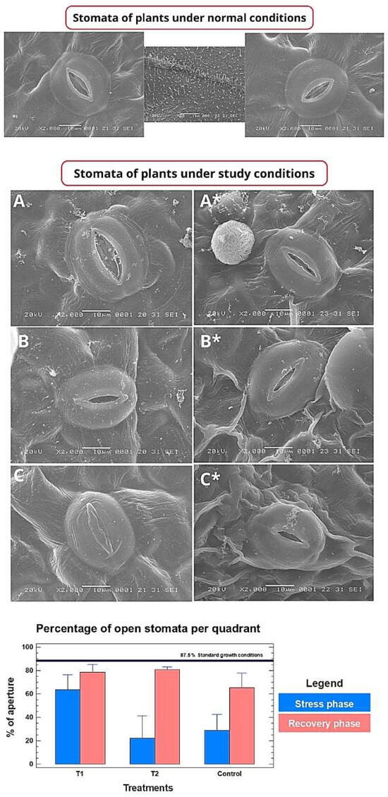 Scanning electron microscopy (SEM) allowed the evaluation of the impact of heat stress at the cellular level. Under stress conditions, stomata of control and vector plants were predominantly closed and showed signs of deformation and damage (Figure 4A,C, bottom graph). In contrast, plants treated with CpRAP2.4a presented a higher proportion of stomata with adequate opening and a more preserved morphology (Figure 4B, bottom graph). Quantitative analysis of the frequency of open stomata confirmed these observations: during the stress phase, the percentage of open stomata was significantly higher in the CpRAP2.4a group compared to the control and vector groups (Figure 3, bottom graph). After the recovery phase, stomata of treated plants showed a greater capacity to return to their normal open state (Figure 4A*–C*).