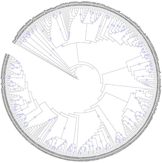 To investigate the phylogenetic and evolutionary relationships among NAC TFs in wheat, a maximum-likelihood tree was constructed using RAxML with 377 NAC sequences and 100 bootstrap replicates (Figure 2). Many of the NAC domains among the initially identified 441 sequences shared high sequence similarity. To reduce redundancy and prevent over-representation of nearly identical sequences in the phylogenetic analysis, we used CD-HIT (≥95% similarity) to cluster highly similar sequences and retained only a representative sequence from each cluster. Thus, after this filtering step, 377 sequences were used when constructing the tree (Supplementary Table S2). The resulting tree revealed clear clustering of NAC proteins into multiple distinct clades, indicating evolutionary diversification within the family. Most internal branches showed high bootstrap support, demonstrating the statistical reliability of the inferred relationships. This phylogenetic framework provides a basis for classifying NAC proteins and selecting candidate sequences for further functional characterization.